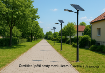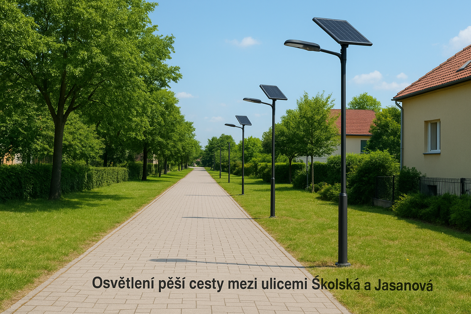 Instalace pěti solárních lamp podél pěší cesty spojující ulice Školská a Jasanová. Osvětlení zlepší bezpečnost pro chodce, především děti a seniory, kteří cestu využívají.